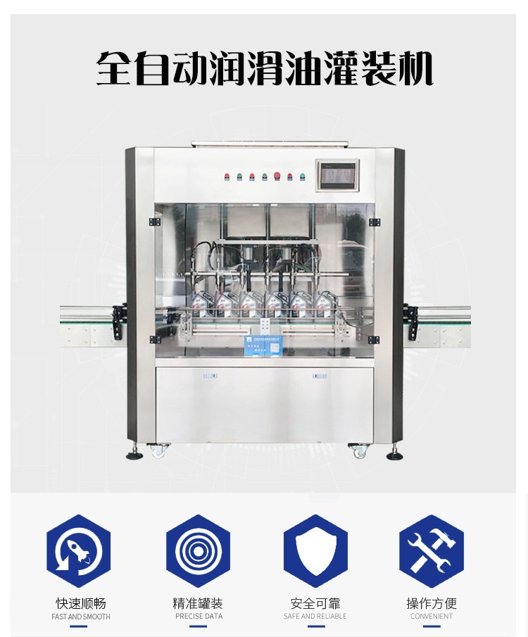 該六頭柱塞式全自動潤滑油灌裝機獨特的灌裝頭設計及真空回吸系統,確保灌裝過程無殘油滴漏,快慢雙速灌裝,灌裝速度可調,杜絕溢瓶現象。