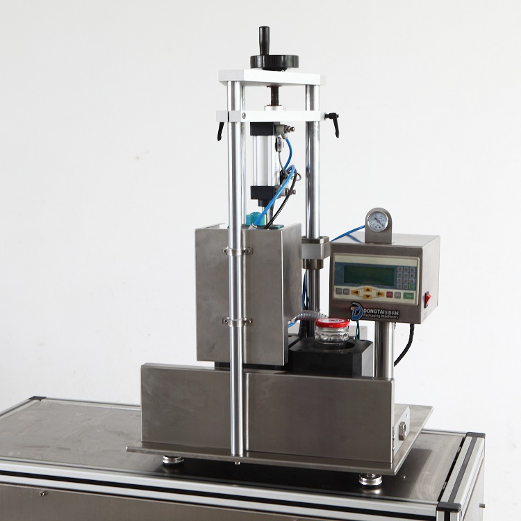先從個詞半自動來講,半自動指的就是手動與機器相結合的操作流程:半自動玻璃瓶真空封口機是采用了人工上瓶,人工出瓶,機動旋蓋與抽真空的方式來完成流程。由于人工上瓶,并且該半自動玻璃瓶真空旋蓋機有無瓶不上蓋,無瓶不抽真空的特點,所以大大減少了對瓶蓋與瓶身的損害。并且人工與機器的配合絲毫不浪費時間,比純手工的生產效率要幾倍,還更節省人力,一臺機器只需一個人便可輕松完成。