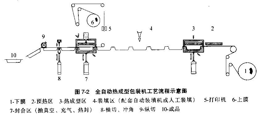 包裝的全過稅由機器自動完成,根據需要,裝填可采用人工或機械實現。內流程圖可見,下卷膜經牽引以定步距步進,經預熱區及加熱區,由氣壓、真空或沖模成型,在裝填區填充物料后進入熱封區。在熱封區中,上卷膜經導輥后覆蓋在成型盒上,視包裝需要可進行抽真空或充入保護氣體的處理,然后進行熱壓封合。后經橫切、縱切及切角修邊形成一個個美觀的包裝成品。至于經裁切后的邊料可由抽吸捅或卷揚裝置收集和清理。